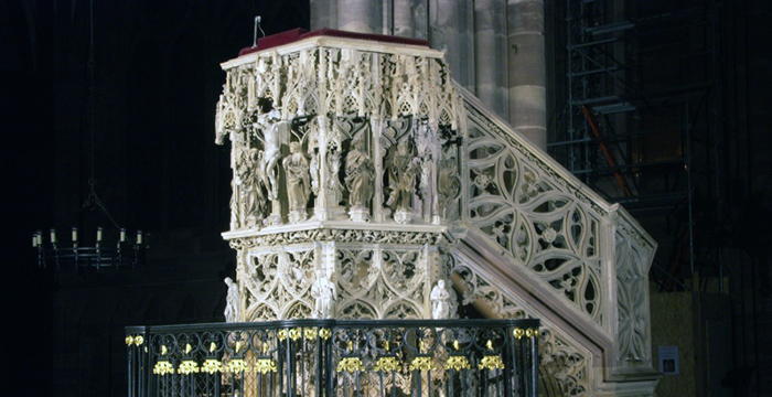 Érection de la chaire pour Jean Geiler. À la même époque, sculpture de l’homme accoudé sur la galerie de la Cantoria.